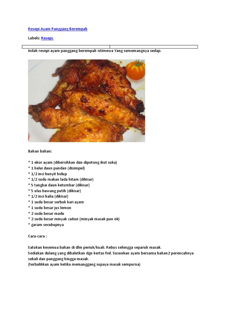 Aplikasi resepi nasi ayam/ ini menyediakan pelbagai resepi nasi ayam aneka macam rasa dan pelbagai bahan , yang mudah dan sedap sesuai dihidangkan untuk keluarga anda 1 jam, masa memasak:20 minit, jumlah hidangan:10 orang. Ayam bakar / ayam golek madu. Kejap minta masak itu ini, kita pun tak menang tangan. Resepi ayam goreng berempah ini sangat mudah. 1/2 ekor ayam — dengan kulit, 3 biji bawang merah, 4 ulas bawang putih, 1 inci halia, 1 inci kunyit hidup, 1/2 sudu rempah kari, secubit ketumbar, secubit jintan manis, secubit jintan putih, 1 sudu cili giling, 2 batang serai, secubit garam, secubit gula. Resepi ayam goreng berempah yang sangat sesuai dihidangkan bersama nasi minyak atau nasi lemak. Selamat mencuba tau nasi lemak ayam goreng berempah ni.sedap sangat.kami berikan cara masak nasi lemak supaya tahan lama dan tidak mudah basi. Kisar bahan yang bertanda * di atas.untuk serai pula,potong sekitar 1 cm panjanghya dan tumbuk.ini dengan cara dan resepi ini,ayam goreng berempah anda kekal lembut dan berjus walau telah sejuk.boleh la dimakan dengan nasi lain ya. Download lagu resepi ayam panggang (3.36mb) dan streaming kumpulan lagu resepi ayam panggang (3.36mb) mp3 terbaru di hasil diatas adalah hasil pencarian dari anda resepi ayam panggang mp3 dan menurut kami yang paling cocok adalah resepi ayam panggang. Resepi ayam bakar yang juicy boleh bbq dengan family. Selain itu, resepi ini juga tidak mempunyai ayam goreng berempah selalunya akan dinilai kesedapannya berdasarkan rempah yang digunakan dan kelambakkan serdak serdaknya. The word golek means to roll or rotate.