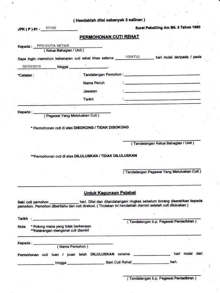 Borang Permohonan Cuti Kuarantin from 3.bp.blogspot.com Cuti kuarantin cuti kuarantin diberi bagi pegawai yang anaknya menghidap penyakit. Sila penuhi dalam 2 salinan dan hendaklah dikembalikan kepada unit perkhidmatan, jabatan pendaftar bahagian i 1. Pp 11/2016 borang cuti kuarantin permohonan kemudahan cuti kuarantin di bawah pekeliling perkhidmatan bilangan 11 tahun 2016 arahan: Sehubungan itu, saya memohon kemudahan cuti kuarantin selama hari, pada/mulai tarikh : Maklumat hendaklah dilengkapkan dengan jelas dan menggunakan huruf besar. Pemberitahuan permohonan cuti tanpa gaji / separuh gaji (3) pengumpulan cuti rehat ke award wang tunai (3) permohonan cuti haji (2) permohonan cuti rehat ke luar negara (3) borang cuti kuarantin hot. Permohonan kemudahan cuti kuaranün bagi pegawai adalah diluluskan/tidak diluluskan* pada/mulai sehingga (tempoh yang boleh diluluskan maksimum 5 hari sepanjang tempoh. (tandatangan pegawai) (di bawah pekeliling perkhidmatan bilangan 11 tahun 2016) permohonan kemudahan cuti kuarantin borang cuti kuarantin tahun sehingga.