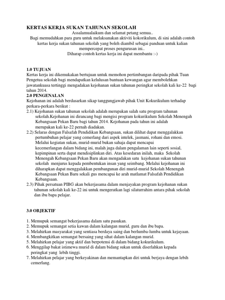 Kejohanan sukan tahunan sekolah sri johor 2020 8hb februari 2020 7.30 pagi stadium azman hashim utm skudaigg. Use the download button below or simple online reader. Kertas kerja kejohanan sukan tahunan. Sebagai acara penting yang sepatutnya menjadi tunjang kepada aktiviti sukan di sekolah, maka olahraga perlulah. Contoh dokumen rks, rkjm dan program kerja kepala sekolah. Kertas kerja kelas tambahan sabtu. Contoh sasaran kerja tahunan (skt) guru. (nama program) ( bahasa melayu sahaja ). Secara garis besar dikelompokan dalam. Kertas kerja program peningkatan akademik. Kertas kerja bulan sains dan matematik. Artikel ini membahas lengkap kertas kerja audit dari pengarsipan kepemilikan & kerahasiaan susunan metode indeks jenis syarat isi tujuan pengertian. Dibentuk setelah kertas kerja program telah siap disediakan oleh.