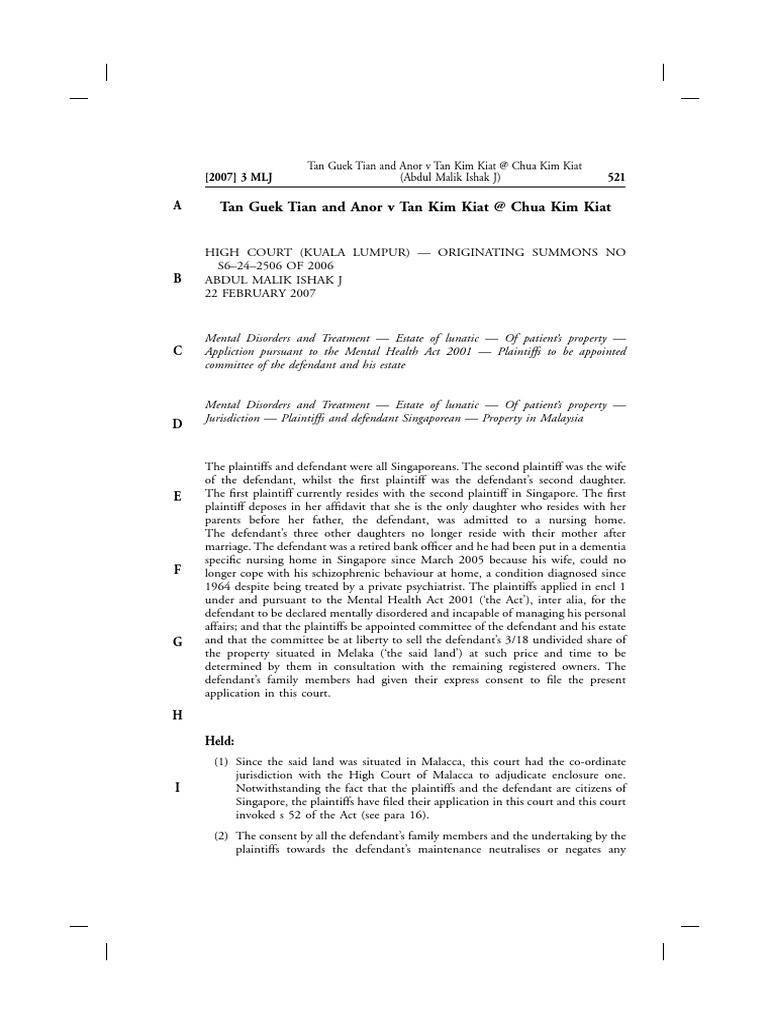 A person suspected to be mentally ill may be admitted involuntarily upon an application to the medical director by a relative of the person; See full list on thomasphilip.com.my The importance of ensuring the safety of the mentally disordered person is further captured in section 73(2) of the mental health act where it was provided that even if the court does not appoint a committee of person, it can still subsequently make an order handing the mentally diso. 9mental health laws of malaysia act 615 *mental health act 2001 an act to consolidate the laws relating to mental disorder and to provide for the admission, detention, lodging, care, treatment, rehabilitation, control and protection of persons who are mentally disordered and for related matters. If this is not the case, only a committee of estate would be ordered.