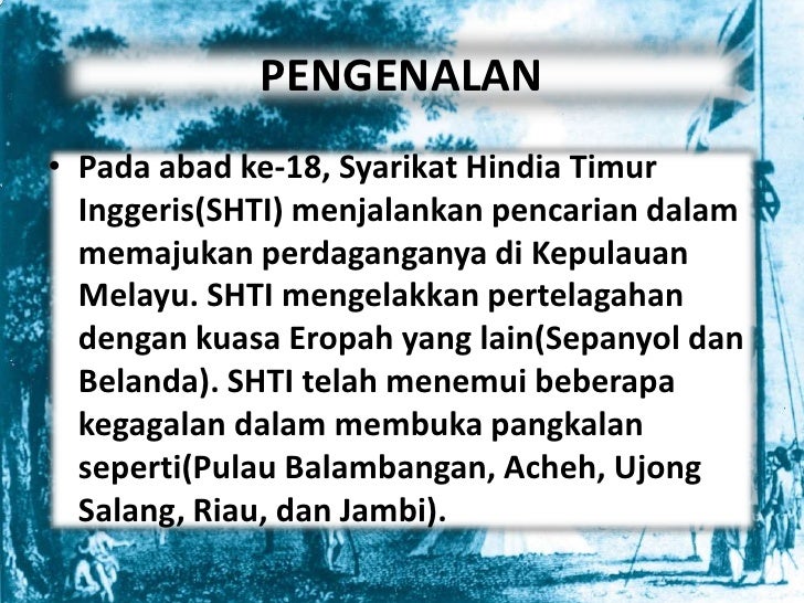 Syarikat hindia timur inggeris (shti). Bantuan dari firma jourdain sullivan and de souza raja siam iaitu rama iii syarikat hindia timur belanda (shtb) tentera minangkabau. Syarikat hindia timur inggeris (bahasa inggeris: § peristiwa dahagi india yang tercetus pada tahun 1857 jelas menunjukkan kegagalan syarikat hindia timur inggeris (shti) memerintah dan mentadbir benua kecil india. Syarikat hindia timur inggeris (bahasa inggeris: Syarikat hindia timur inggeris (shti) membantu kerajaan britain i. Nrhazrn is waiting for your help. 1 ways to abbreviate syarikat hindia timur inggeris. Just then, a man named francis light knocked on the king's door. Sungguhpun begitu, shti perlu mencari sebuah pelabuhan untuk dijadikan tempat persinggahan. Pembubaran syarikat hindia timur inggeris (shti). Francis light was a man working with the shti (don't misread that) or the syarikat hindia timur inggeris. These were a group of british people who were sent out by the british government to explore the eastern civilisations.